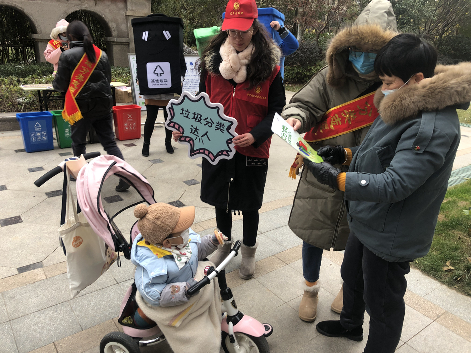 活動中,志愿者們身穿“可回收物”、“廚余垃圾”、“有害垃圾”、“其他垃圾”四色玩偶服,通過向居民發(fā)放宣傳單頁、開展“垃圾分分樂”、“垃圾分類跳棋”游戲等方式,向其宣傳垃圾分類相關知識。活動現場氣氛火熱,社區(qū)居民不畏嚴寒,紛紛從家中拿出廢舊電池、舊水銀溫度計等有害垃圾換取垃圾袋。