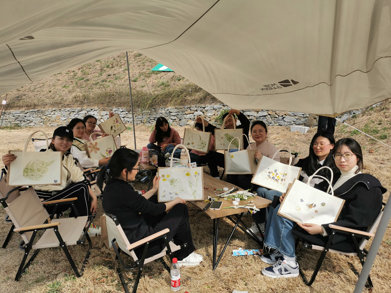 三月春意盎然,大家在指定區(qū)域采集新鮮植物,并通過(guò)自己的設(shè)計(jì)將植物拓染在帆布包上,留下了春天的印記,把春色“袋”回家。